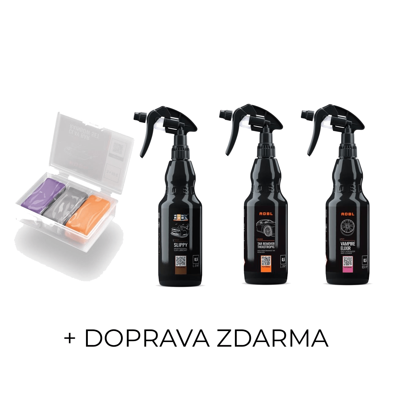 • ADBL Slippy (500 ml): Špeciálne vyvinutý lubrikant, ktorý zabezpečuje maximálny sklz claya po laku. Znižuje trenie a eliminuje riziko vzniku drobných škrabancov. Bonusom je, že ho môžete využiť aj ako pomocníka pri sušení auta.